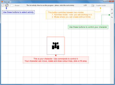 The user may arbitrarily browse, solve or skip activities. EasyLogo does not check a user’s solution. A user may also switch environments from the Activity mode to the Programming mode where they can freely create any drawings that they like.